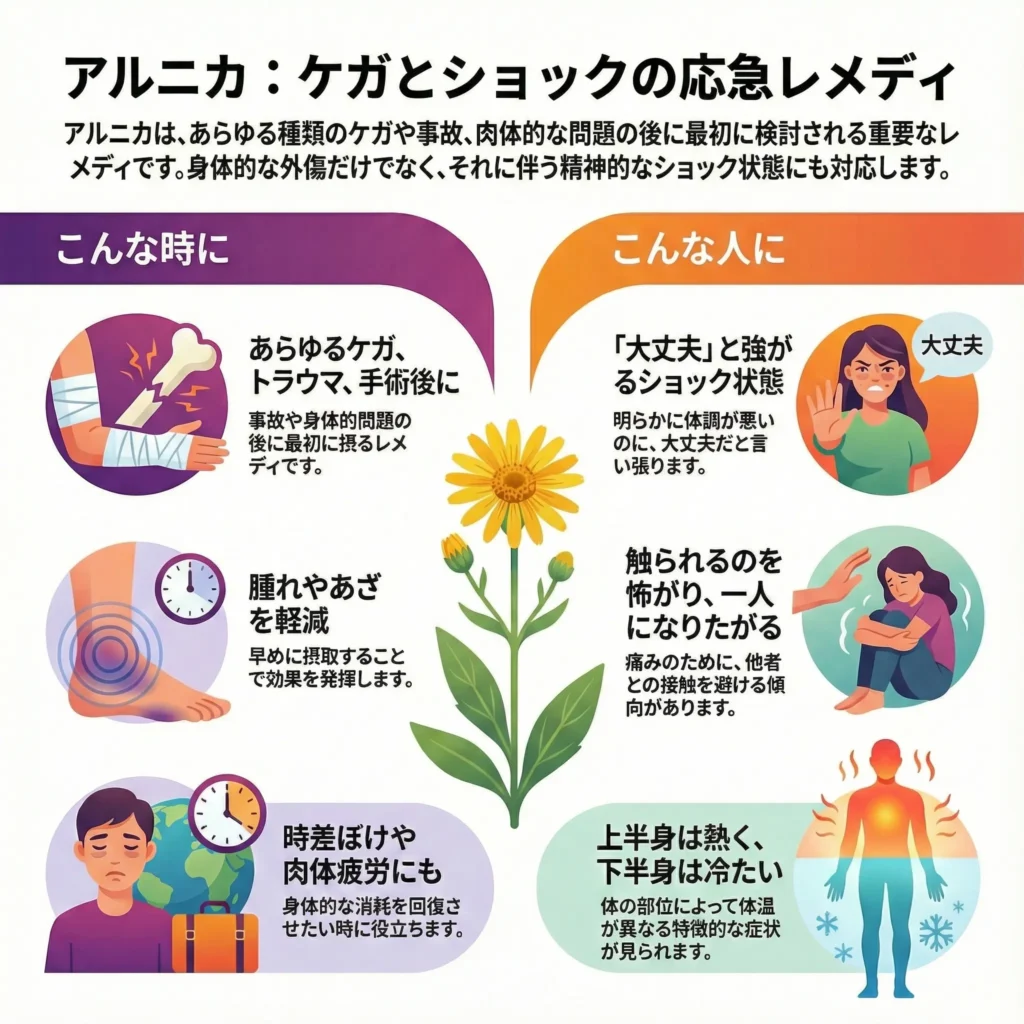 ホメオパシーにおいて、怪我やトラウマに対して最も有名なレメディです。打撲、捻挫、手術後の回復、さらには時差ボケや激しい肉体労働後の筋肉痛まで、身体に「衝撃」を受けた際の第一選択となります。精神的なショックで、周囲に「大丈夫だ」と強がって触れられるのを拒むような時にも非常に有効です。