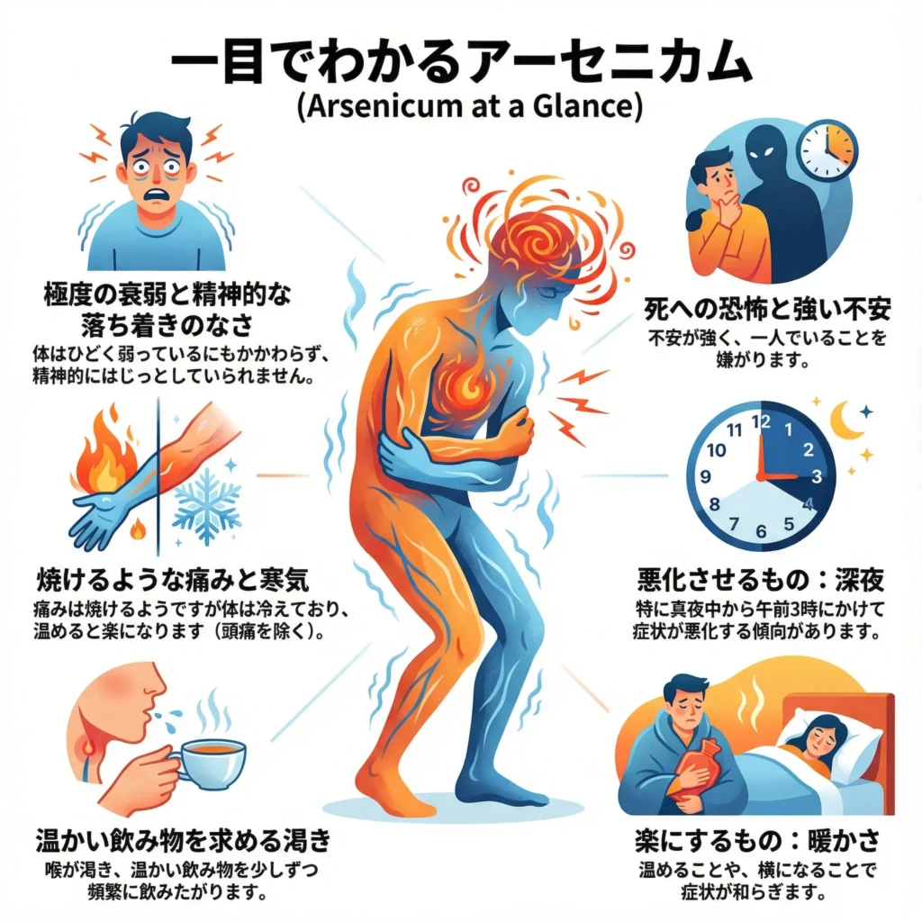 心身ともに強い不安と落ち着かなさを感じ、衰弱している時に合うレメディです。食あたりによる下痢や嘔吐、喘息など、分泌物や痛みが「焼けるように熱い」のが特徴ですが、不思議と患部を温めると楽になります。潔癖な傾向があり、真夜中に不安が強まって一人になるのを恐れる際によく用いられます。
