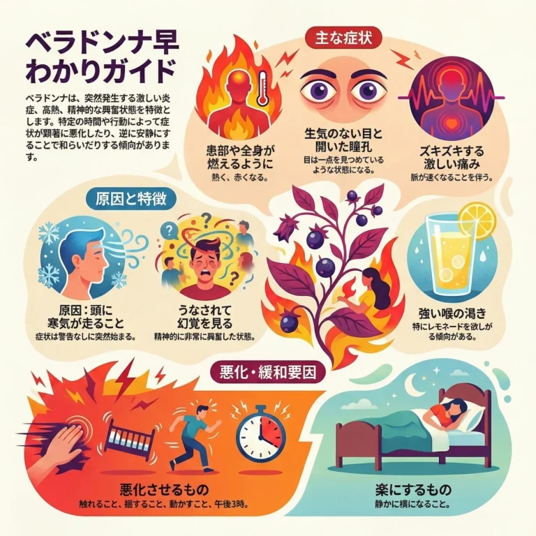 「突然の激しい発症」がこのレメディの代名詞です。顔が真っ赤に上気し、瞳孔が開いて、触れると火がつくように熱い高熱に合います。脈打つようなズキズキする頭痛や喉の痛み、興奮してうなされるような状態に非常に有効です。光や音、揺れといった刺激をひどく嫌います。