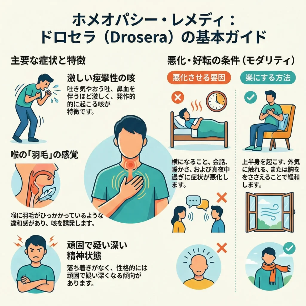「百日咳」の代表的なレメディであり、一度出始めると止まらない、激しい発作性の咳に作用します。喉に羽毛が引っかかっているような違和感があり、咳き込んで吐きそうになったり、鼻血が出そうになったりするほど激しいのが特徴です。横になると咳が悪化するため、上体を起こして過ごしたくなる状態に適しています。