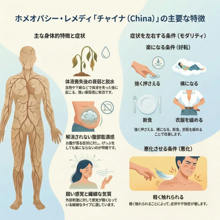 激しい下痢、発汗、出血など、身体の大切な水分(体液)を失った後の虚弱状態を回復させるレメディです。神経が過敏になり、疲れやすく、お腹がパンパンに張って苦しい状態に適しています。カーボ・ベジと似ていますが、チャイナは「げっぷをしてもお腹の張りが楽にならない」のが見分けるポイントです。