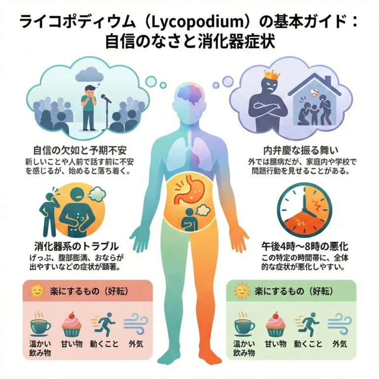 深い「自信のなさ」を抱えながらも、それを隠そうとして威圧的になったり強がったりするタイプ(内弁慶)の人によく合います。消化器系に作用し、少し食べただけでお腹がガスでパンパンに張るような消化不良や便秘に適しています。症状が身体の右側に現れやすい、あるいは右から左へ移動するのも大きな特徴です。