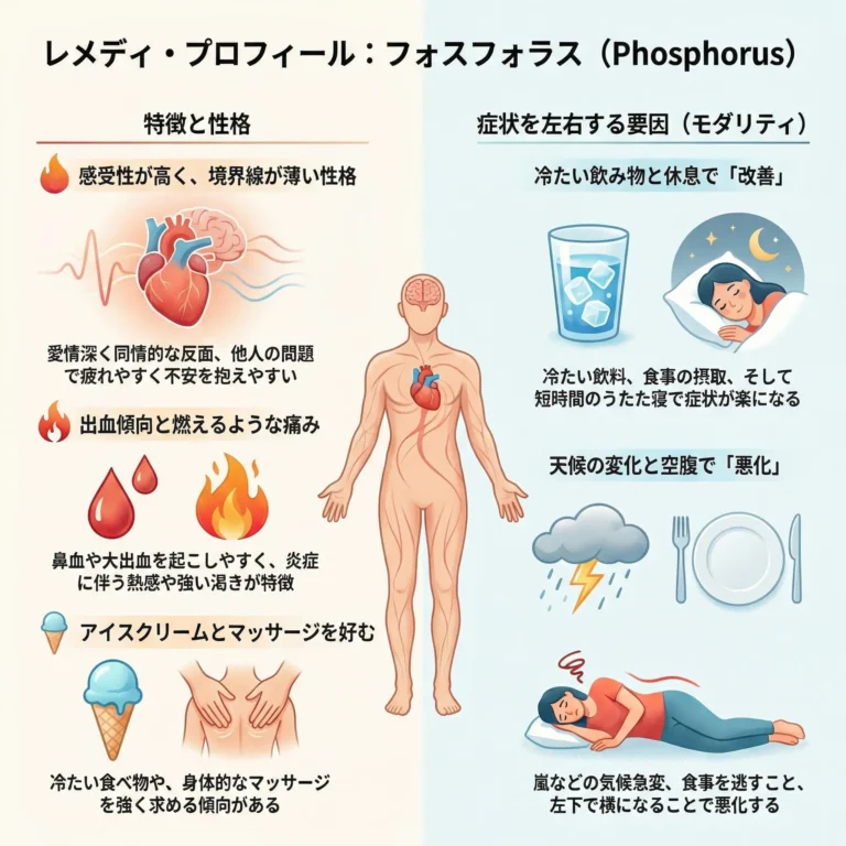 明るく陽気で感受性が豊かなタイプの方に合うレメディです。境界線が弱いため他人の問題で疲れやすく、急な天候変化や嵐に不安を感じることがあります。身体面では、燃えるような熱や痛み、出血のしやすさが特徴です。鼻血や激しい咳、喉頭炎、冷たい飲み物を欲しがる胃の不調によく用いられます。