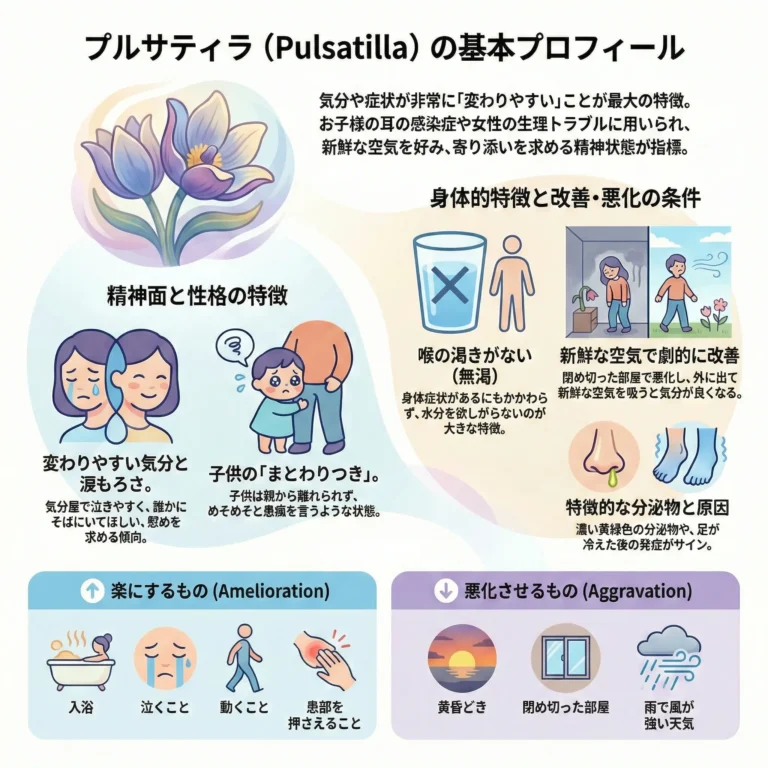 「変化しやすさ」が最大の特徴で、泣き虫で寂しがり屋な子供や女性に多いレメディです。まとわりついて慰めを求め、新鮮な外気を強く欲しがります。風邪の終わりの黄緑色のドロッとした鼻水、耳の感染、生理トラブルなどに適しており、脂っこい食事や閉め切った部屋で気分が悪くなりやすいのが目印です。