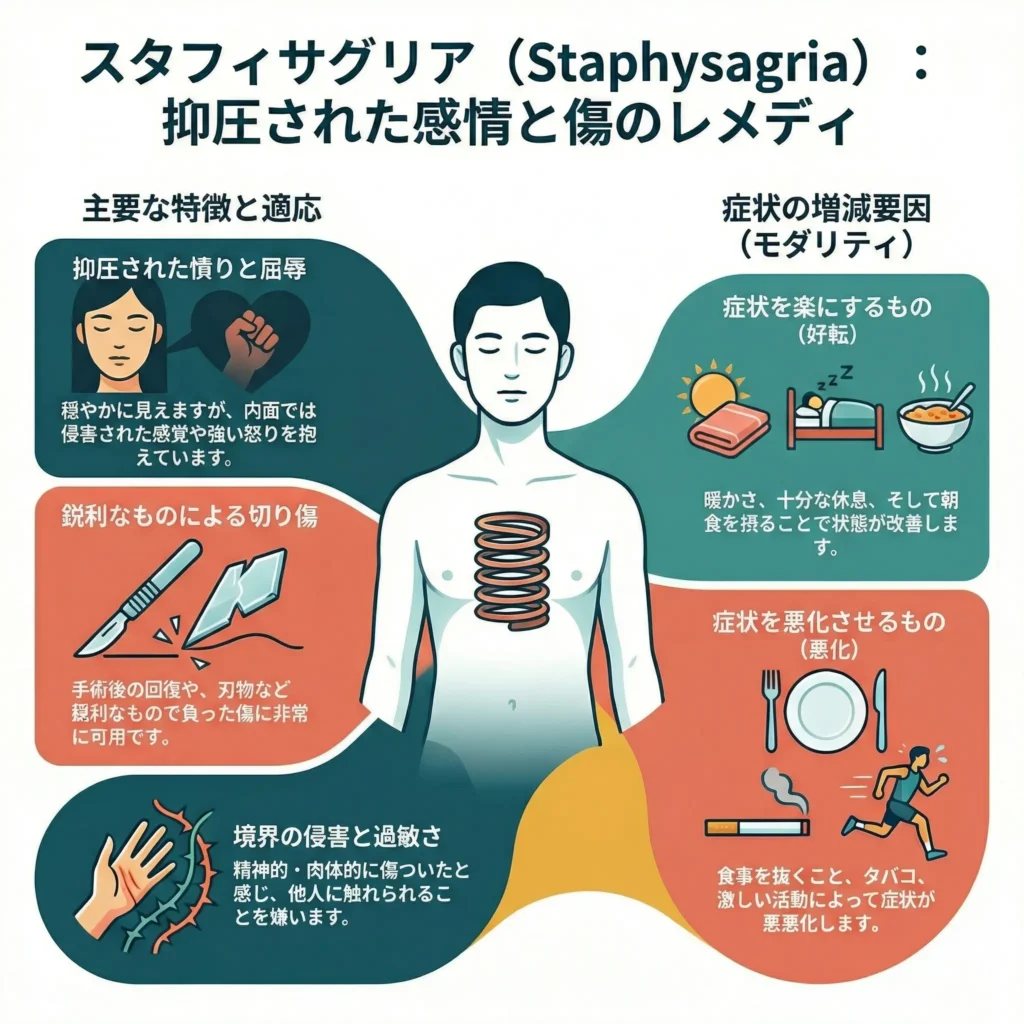 「抑圧された感情」と「鋭利な刃物による傷」に作用するレメディです。人から屈辱を受けたり、理不尽に怒りを感じながらも、それをグッと抑え込んだ後に体調を崩した場合に非常に有効です。また、手術の傷跡や刃物による切り傷の回復を早めます。優しく静かに見えても、内側で強い葛藤を抱えている方に合います。