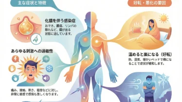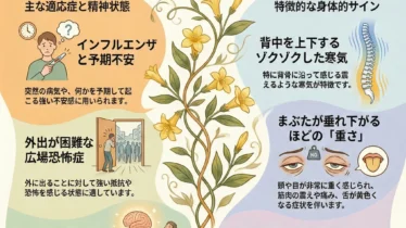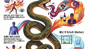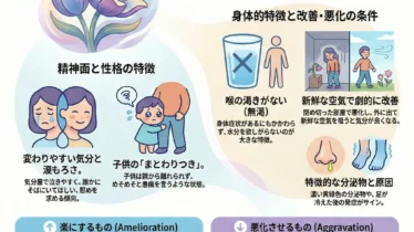 風邪のひき始め、微熱、喉・耳の初期症状、初期の炎症に風邪や中耳炎、喉の痛みなど、あらゆる炎症の「初期段階」をサポートするレメディです。アコナイトやベラドンナほど激しい症状ではないものの、ゆっくりと熱が上がり、顔が赤くなったり白くなったりを繰り返すような、穏やかな炎症状態に適しています。子供の急性病にも使いやすく、家庭に常備したいレメディです。基本情報原料: 鉱物(リン酸鉄)精神面(M)穏やかで落ち着いているが、弱々しい集中力が持続しない身体面(P/G)特徴: 風邪や炎症の初期。鼻血や出血しやすい体質症状: 微熱、喉の炎症、耳痛、鼻水に血が混じる反応: 理由もなく顔が赤らむ。咳をすると胸が痛む。タマゴを食べると悪化する傾向モダリティ(好転・悪化)▲楽になる: 休息、冷たい飲み物、冷シップ▼悪化する: 運動、暑さ、夜(午前4~6時)身体面(P/G)特徴: 弱々しく眠く、全身が重たい。背中がゾクゾクする寒気。症状: 重だるい頭痛、震え、まぶたの垂れ下がり、緊張性の下痢、インフルエンザ反応: 排尿や発汗があると、諸症状が少し楽になる ◎ 楽になる(好転) 排尿、発汗、露天下 ▼ 悪化する(悪化...